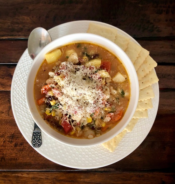 In a heavy-bottomed Dutch oven, melt butter and add diced onion. Sauté until soft and starting to caramelize. Add celery and carrot, stir and cover for a few minutes until added veggies begin to soften. Add minced garlic, good sprinkle of salt, a few grinds of fresh-cracked black pepper, herbs and spices, and allow flavors to meld for a couple of minutes. Add Better Than Bouillon to the pot, then add boiling water from kettle (or just bring the added 2.5 cups of water to a boil in the pot). Stir well. Add all canned ingredients as noted (you’ll want the liquid of the tomatoes in the stoup, but everything else gets drained — no need to rinse), and the fresh or frozen Summer Squash, stirring and allowing mixture to come to a low boil to heat through. Add chopped spinach and wine, stir to combine. Cover and turn heat to low-medium, allowing flavors to meld for 5-10 minutes. Taste and add any additional salt and pepper or other herbs as needed. Add juice of one large lemon into pot and stir. Place 1/4-1/2 cup hot cooked barley into each individual bowl; ladle stoup over barley. Stir to combine. Top with crumbled bacon and a generous portion of freshly-grated Parmesan cheese. If you have fresh flat-leaf Italian parsley on hand, feel free to add that as well. Serve with warm, crusty French bread + butter or crackers. Bon appétit!!!